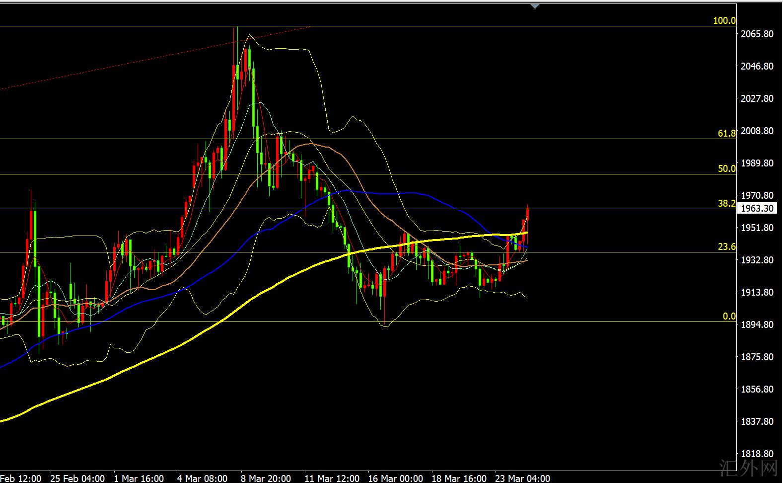 午夜黄金突破日K线布林中轨1958后,发力上探,当前1965左右,上方直指第一计划前期高点1974,及周线布林上缘1983,再突破则看2000关键点位。短时间思路买方回到,低多或者回踩多为主。