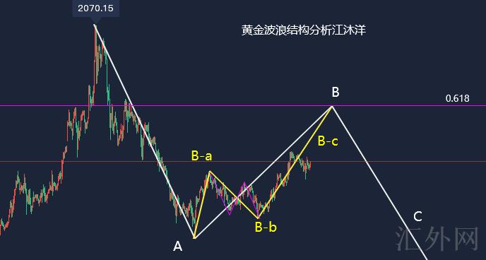 波浪分析,月线级别来说,当前2070能否到顶还不能确定,由于从1680上升结构没有损坏,整体黄金依旧买方趋势,局部行情黄金从2070下挫到1895已完成A浪调动,当前黄金正处在B浪回弹当中,这周黄金往上击穿1950并持稳收线,B-b三浪靠近尾声,预期下周B浪终结开放C浪下挫,若下周行情强劲击穿2000上方,C浪结构将损坏。