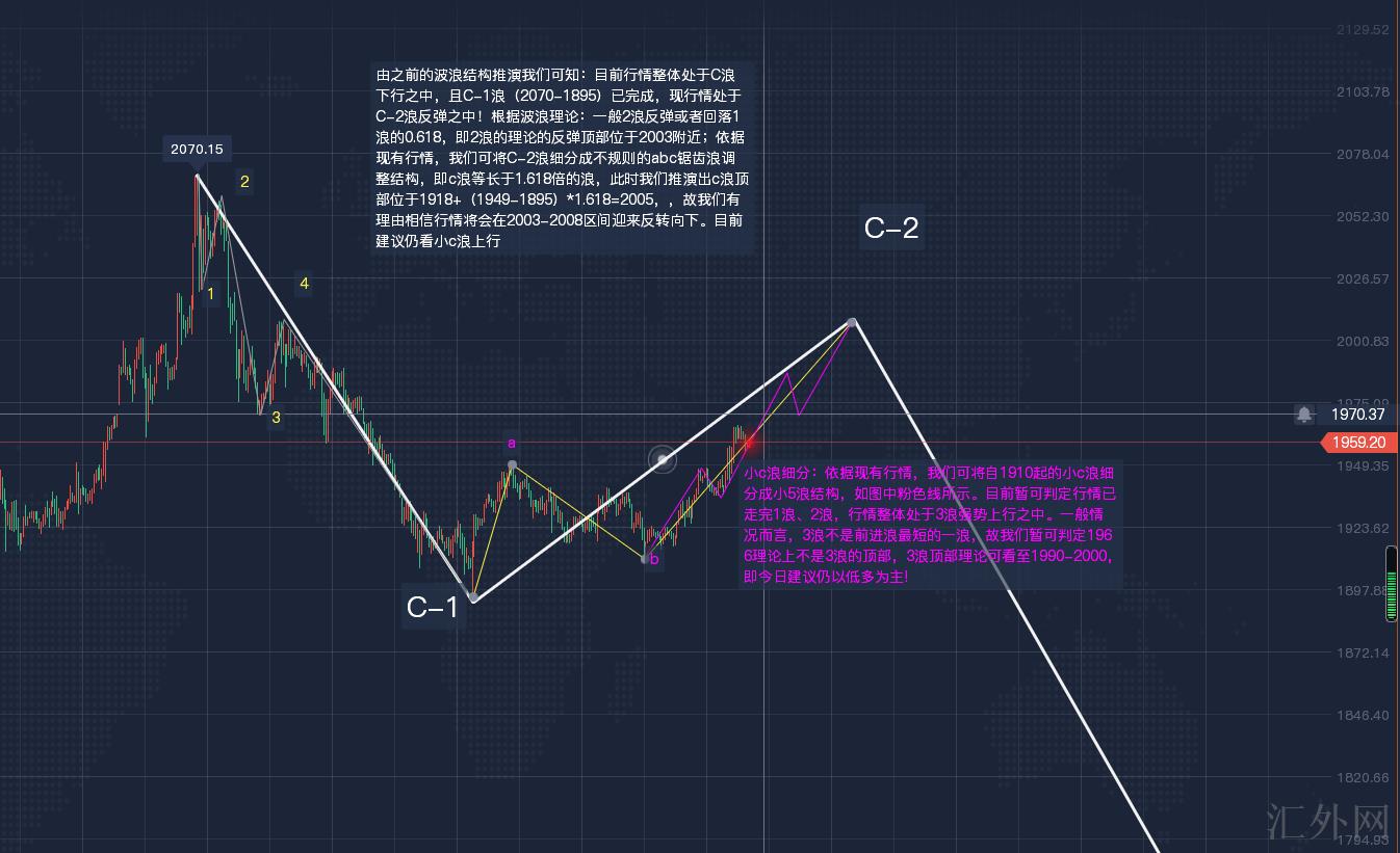 1、由一级别的波浪结构,我们可知:当前行整体处在从2076起的大一级别的C浪下探当中,行情最低回调到1895后又一次筑底1916一线上涨,现可差不多判定C-1浪终结,行情处在C-2回弹当中。