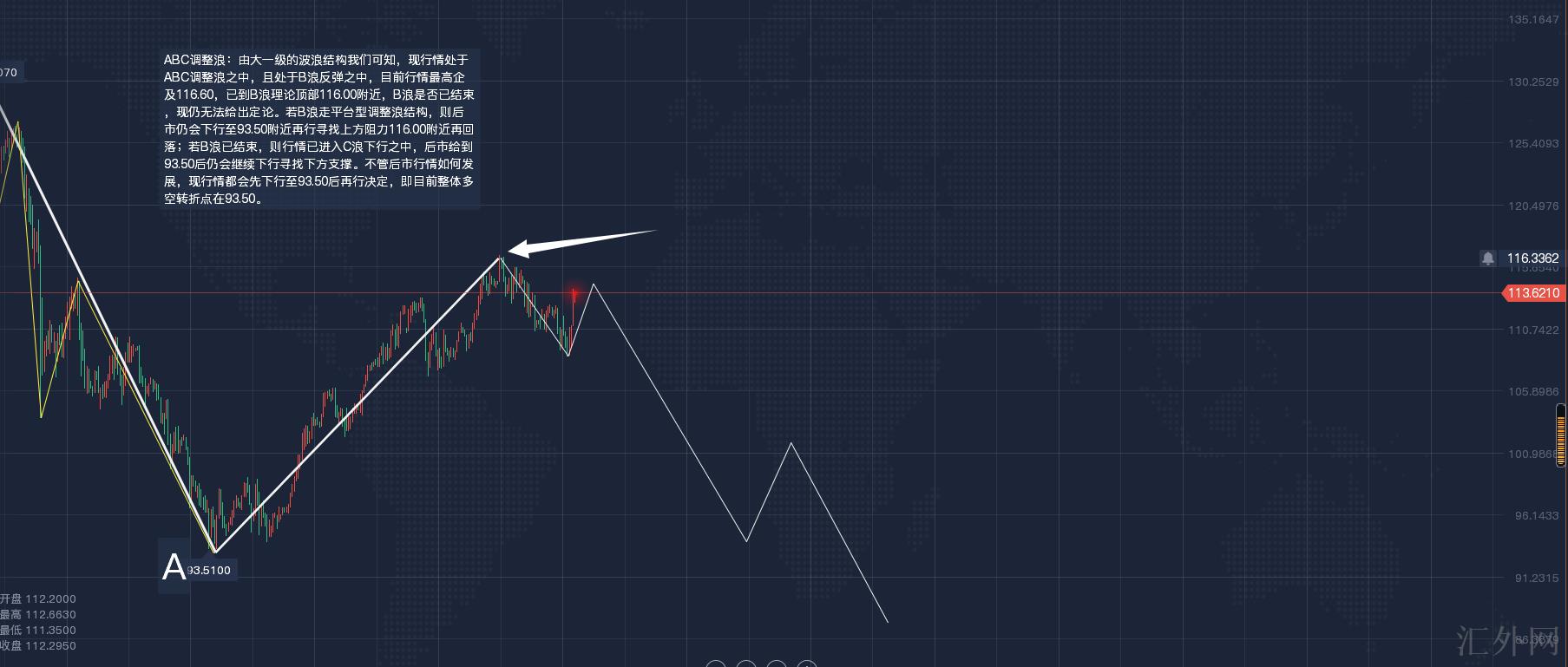 2、ABC调动浪:由大一级的波浪结构我们可知,现行情处在ABC调动浪当中,且处在B浪回弹当中,当前行情最高企及116.60,已到B浪理论顶部116.00左右,B浪能否已终结,现仍无法给出定论。若B浪走平台型调动浪结构,则后市仍会下探到93.50左右再行寻求上方压力116.00左右再回调;若B浪已终结,则行情已进入C浪下探当中,后市给到93.50后仍会持续下探寻求以下支撑。不管后市行情如何发展,现行情全将先下探到93.50后再行决定,即当前整体多空转向点在93.50。