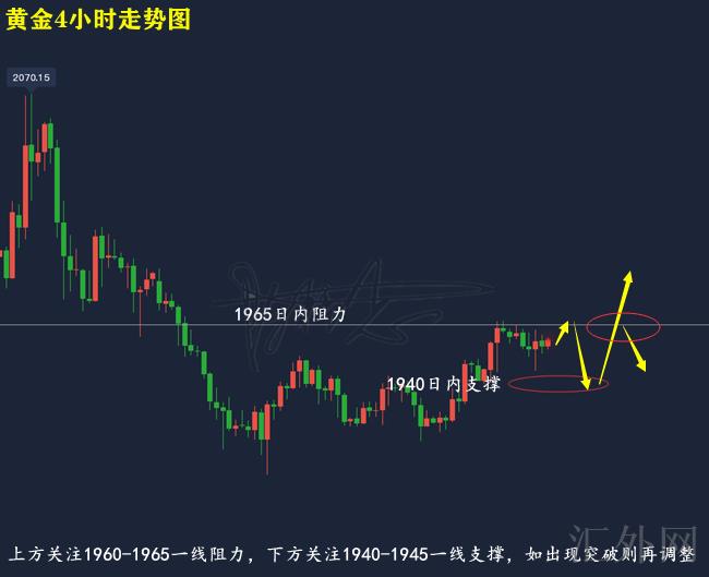 黄金技术分析来分析,日K线上,上星期五黄金开盘适当上升后下挫,并在跌向MA5日移动均线位置后回涨,报得小阳十字星,日K线上,当前行情短时间仍有盘整下探风险;4小时上,上星期五黄金在亚盘持于隔日内新高位运行后展开下挫,并在跌向中轨20日K线位置后回涨,目前布林带处在开口期,MA均线迈出死叉,KDJ随机指标三线朝下,MACD指标顶背离,快慢线有朝下趋势,综合来说,日间黄金推荐高空低多执行操作,上方注意1960-1965一线压力,以下注意1940-1945一线支撑,同期关注上下击穿情形执行调动。