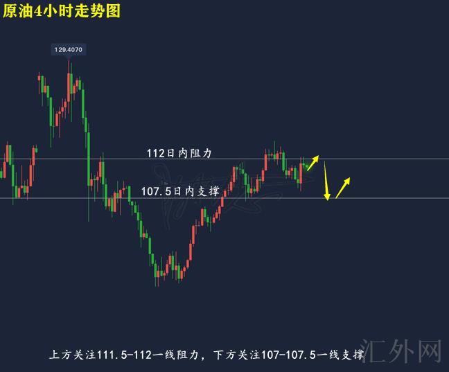 黄金技术分析来分析,日K线上,上星期五原油开盘下挫,在跌向中轨20日K线后回涨,并刷新日间高点回调,报得带上下影线的小阳,日K线上,行情最多刺破5日移动均线,仍有下探试探的机会性;4小时上,上星期五原油走迟缓下探,在望将刷新下缘位置后回涨,收回中轨位置,目前布林带处在平口期,MA均线迈出死叉,KDJ随机指标三线并拢往上,MACD指标绿色量能柱放量,快慢线死叉朝下,综合来说,原油当前短时间仍有抑制,日间推荐先空后多,上方注意111.5-112一线压力,以下注意107-107.5一线支撑,若显现击穿则再执行调动即可。