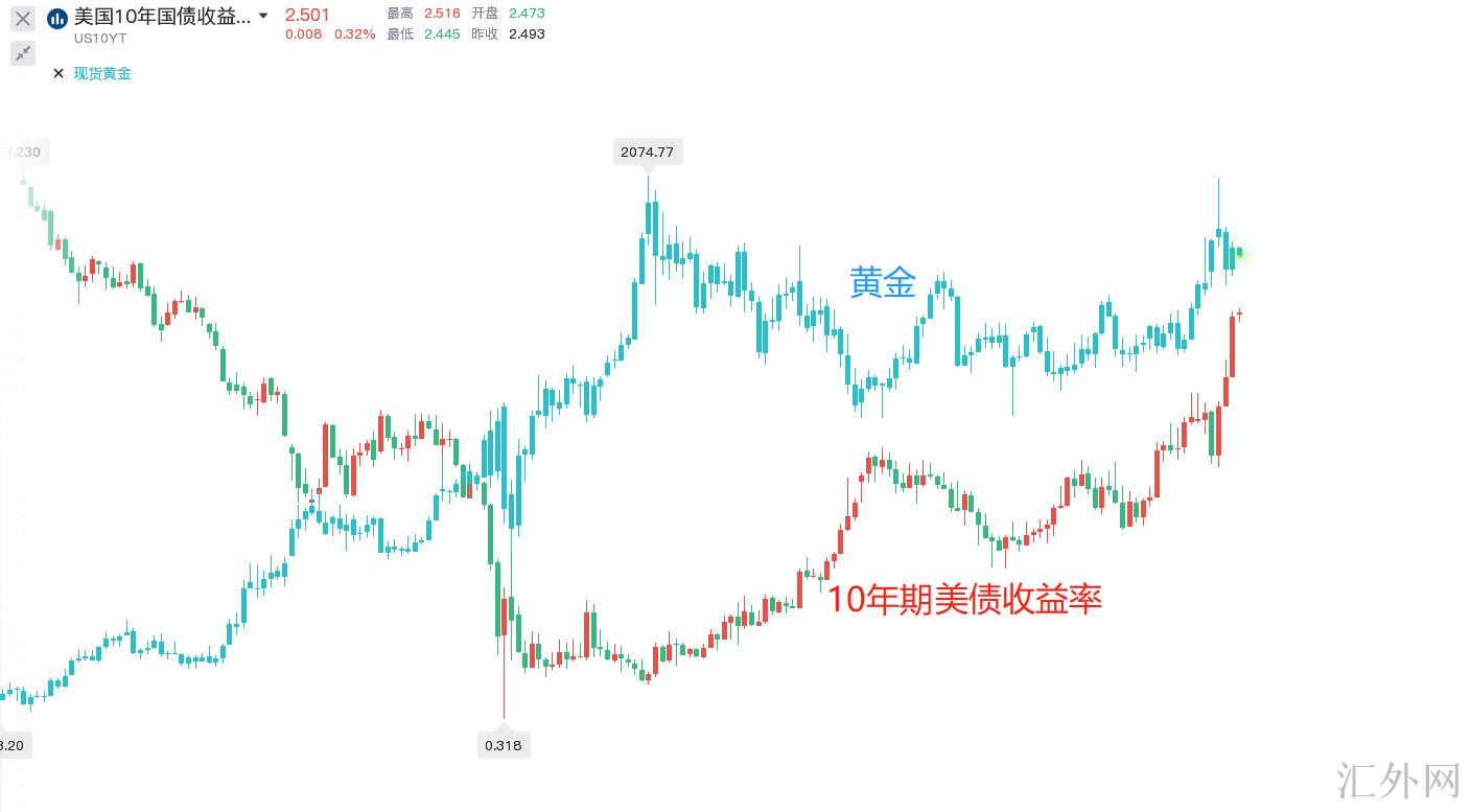 债券收益率上升表明居民对经济上涨积极,资金愈加青睐风险投资,进而降低市场避险情绪,避险减退黄金自然很难独善其身,所以债券收益率和黄金之间的关系可以理解为负有关。当前美国10年期国债收益率已经升高到2.5%,完全修复冠状流行病和流行病前的经济衰退所导致的影响。