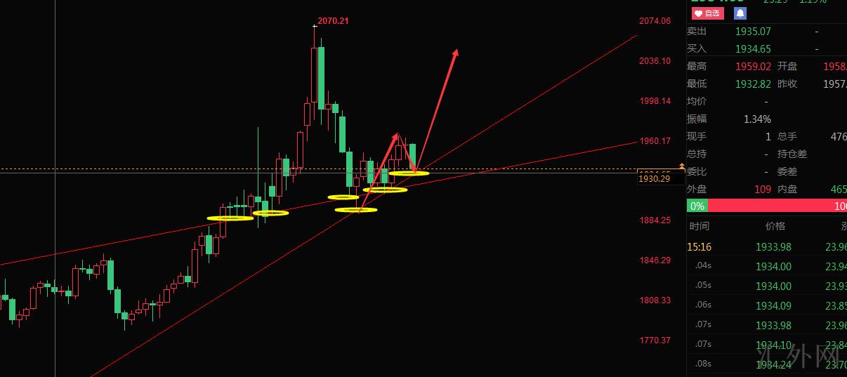 今天核心支撑1930和1920一线。黄金没有实体突破双趋势线支撑1920以前今天逢低买涨为主!