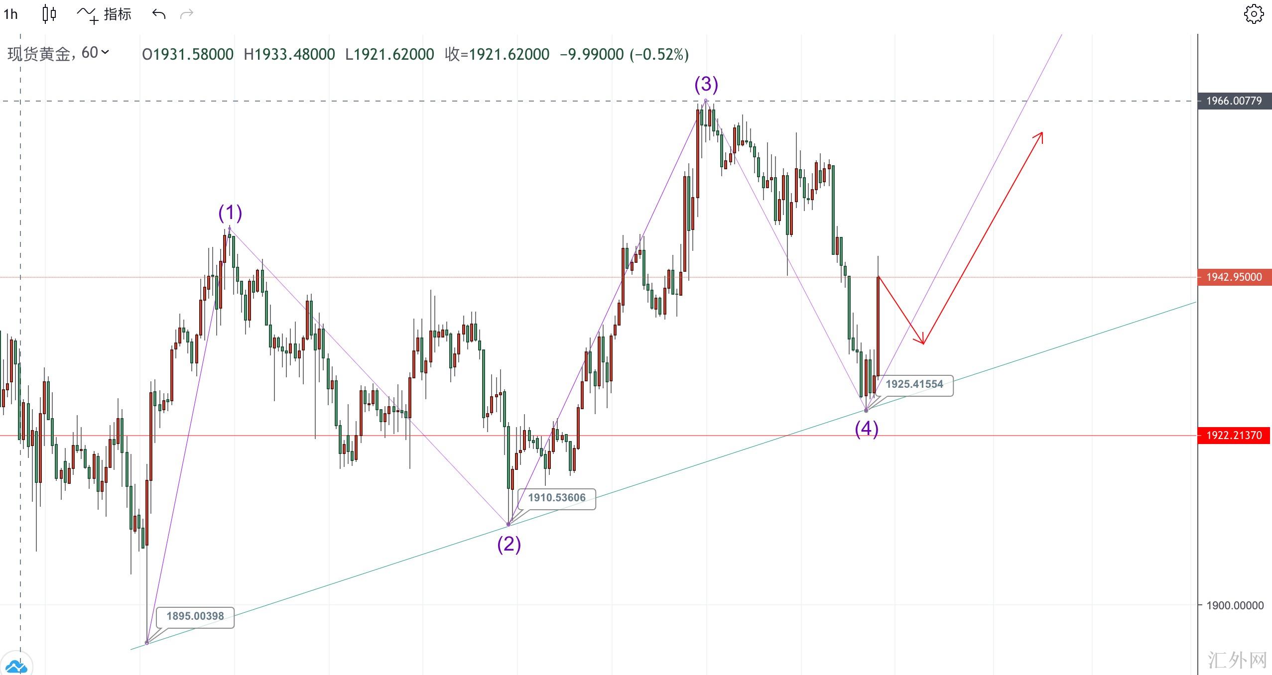 黄金交易思路:黄金亚盘下探走了4浪下探,在1925左右得到支撑上涨,当前行情走的5浪上涨。但是在1945遭遇阻力,当下主交易参考依旧等回调买涨,当前撰文行情在1930左右。推荐现价30直接多,止损位1924左右,计划看1945上方。