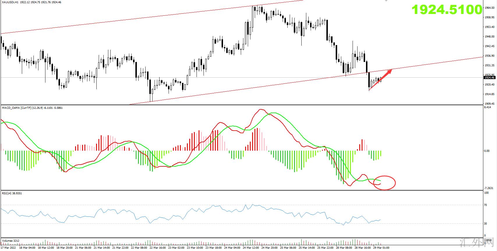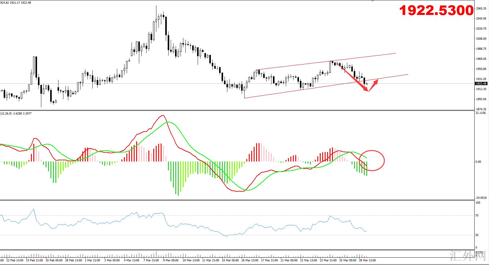 此外30分钟级别已经迈出了底背离形态,当前正在动员黄金的回弹,30分钟以及小时级别的快慢线金叉后面的运行就很重要了,假使能够在0轴以下又一次死叉的话,那么黄金大约率会回踩成功,证实突破有效,但是假使直接上穿了0轴,黄金大约率会突破1930的抑制,那么黄金就会又一次更换一个震荡区间持续震荡。