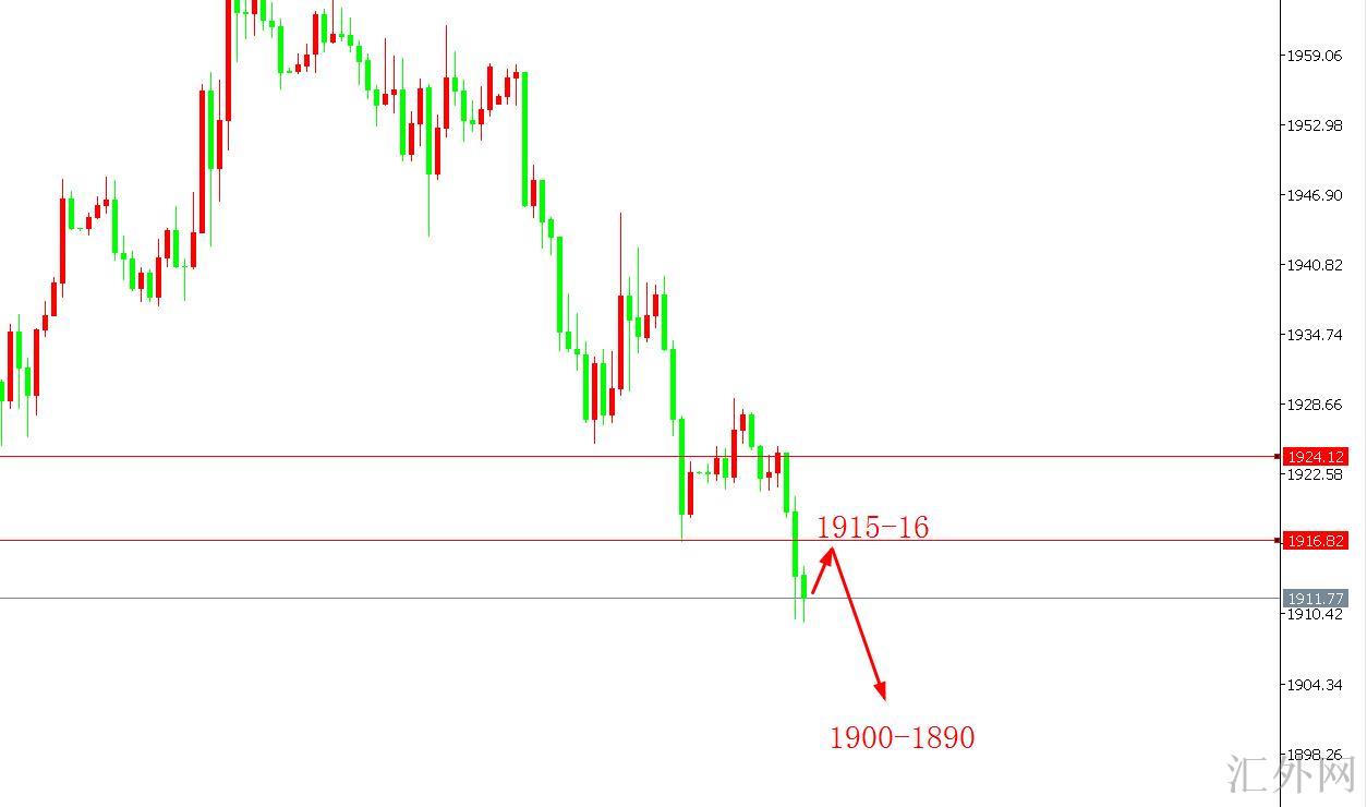 黄金价格破了凌晨的低位1915后,直接跌到下一个支撑点置1910,当下保持在1913左右震荡,当下的不管是小时线依旧4小时线都已经呈现弱势局势,首要是从两层面来看,一是凌晨的低位就是我们分析的行情强弱的根据,也就是我们讲的顶底转换的位置,通俗的讲就是阶梯形态,前期的底往往就是当下的顶,二是实盘口诀中,欧盘破底后,美盘必然新低,至于低到哪里去,可能是1900,可能是1880,我们临时不猜底,就让行情尽情的走,让我们的利润尽情奔跑。这里再延伸下口诀中显现的困难,依照以往的行情,若是1915这里不破底,那么美盘势必得走震荡。