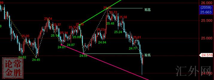 趋势分析。白银昨日跟随黄金行情,增速痛跌到24.80美元一线,日k线收一根实体漫长的大阴线,差不多吐回了前面三个交易日的升幅。表明了短时间回弹完全终结,和第三驱使浪下挫行情的起步。昨日我们在日k线图上,就运用了黄金分割扩展线测算了第三驱使浪行情将来的计划区域,大概在61.8%和100%两档位置之间,价格为24.0-23.40美元区间。