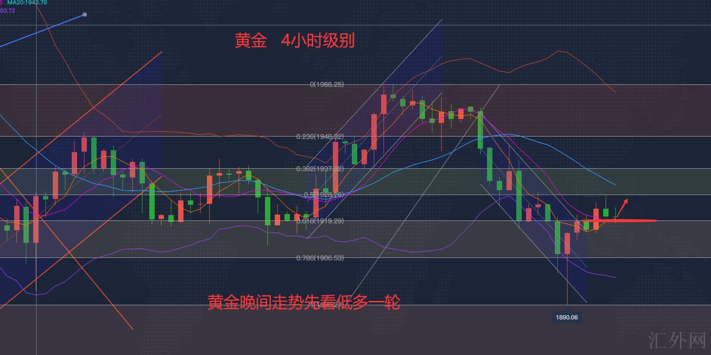 日K线结构当中布林带呈现走平状态均线同样走平无显著方向指示,整体的短线价格上则是冲顶回调伴伴随摸底回涨保持性极差即短线主流依然处在震荡结构当中,对于震荡来说多空布局都可以导致日间区间切换的困难。亚盘我们聊到过黄金今日首要看震荡,亚盘高空按计划收获利润,夜里我们看一次1920/18处支撑前期低位1906没有给到以前我觉得是值得适当在4小时周期内的0.618名置支撑看一次涨。