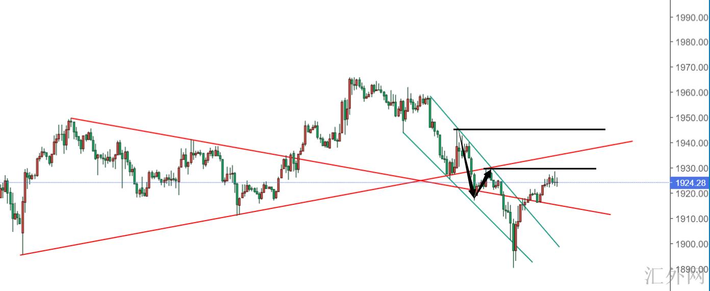 意思就是:先做初始V型后面的反跌试图,即1925点看空,注意趋势线以下1915的突破,这一连串动作完成了,那么你目睹1890突破的几率就大了,所以我会这么执行试图。