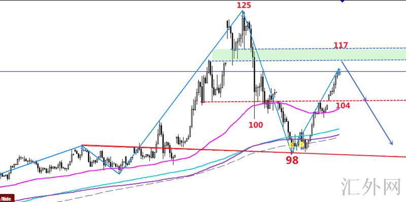 最近因俄乌局势发酵,原油涨疯了!价格最多攀升125美元左右,为2008年末以来最高;因西方制裁致使俄罗斯石油出口受扰,欧洲和美国盟友商谈禁止进口俄罗斯石油。欧佩克+成员昨日表明,欧佩克+不应参与政治,当前该联盟面对越来越大的阻力,需求成员国就俄乌事件采取措施,平稳油价是平稳的任务。当下原油冲顶115名置遇阻,又一次跌至100关口左右,其行情和李鸿彬预计完全相符,向上瞧行情图就一目了然。原油日K线遇阻于布林中轨走跌,MA5—MA10均线死叉下探抑制,代表短时间卖方占优;而月线以流星线收官,上方具有长长上引线,代表高点有大批卖方抑制。今日有希望跌穿100关口到94-95名置,操作上可在此布局多单,回弹104可空。