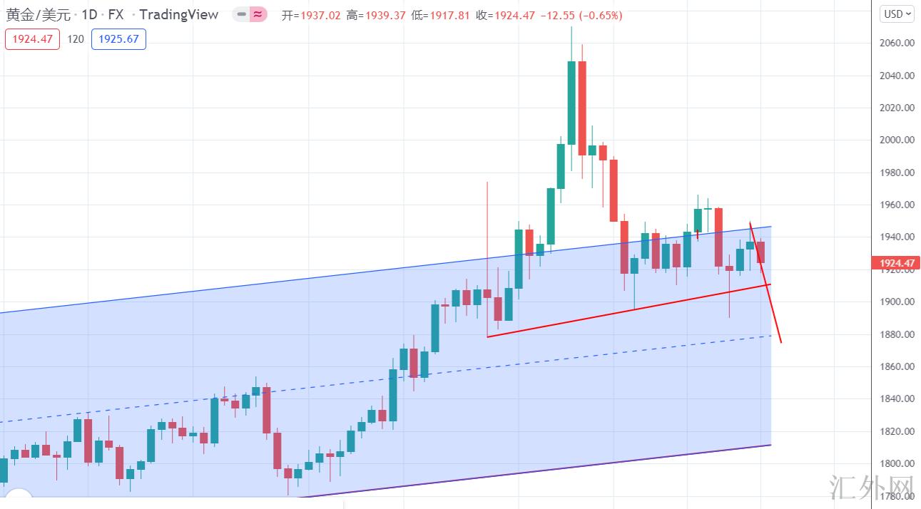 黄金月线长上影小阳线,单看月线黄金需求有一次回调。支撑1912和1890,行情假使后期跌穿1912,以下持续看1890。一旦跌穿1890,以下空间就比较大了,1870-1855-1826均为计划位。假使行情撑住,还会持续去1958-1980甚至上2000。周线这周收阴,但是实体并没有突破,所下方周不消除收阳,阴阳转换,支撑1920压力1958。然而单看日K线,下星期一依旧倾向先回调,压力1932,支撑1921,星期一关注其突破。