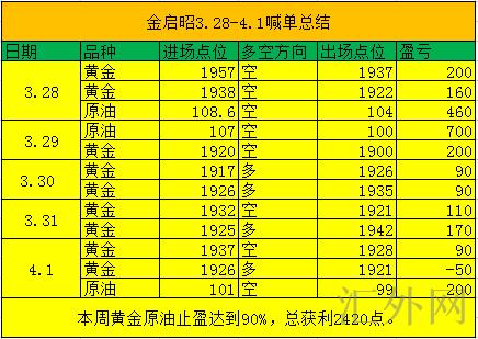 这周原油黄金总的操作堪称完美,大周期先空后多,周初黄金1957.1938.1920分别买跌黄金,黄金暴跌止盈,星期二黄金看涨,1917.1925.1926买涨再大赚,原油三连空,三连捷,皆是大赚,这周原油黄金的操作止盈90%,总获利2420点,虽单子不是不少,但是精准率很高,假使你做的不理想,可以找启昭聊一聊,到当下为止,实盘客户全部盈利、