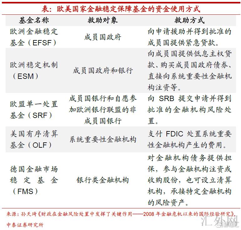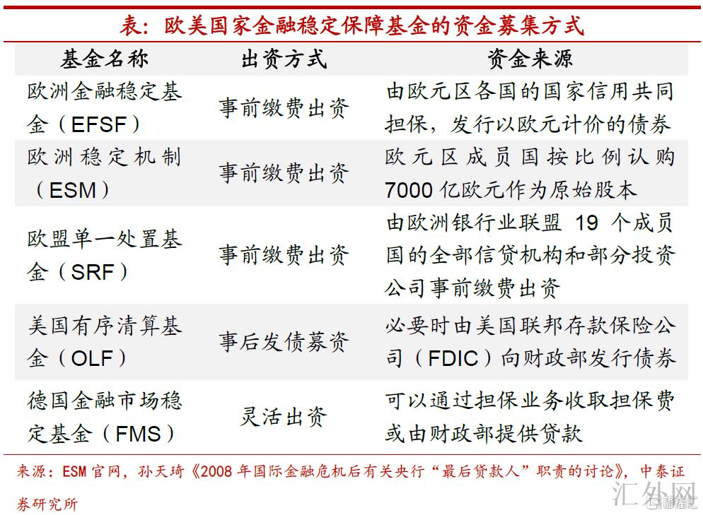 又一次,从资金来源向上瞧,以海外发达经济体的有关经验,金融平稳基金的资金来源首要有三部分:一是由金融机构以“生前遗嘱”的形式缴纳资金;二是财政资金直接注资或发行政府债券;三是被处置的金融机构在危机终结后归还资金。而这些资金的出资节点分为事前、事后和灵活三种,欧洲金融平稳基金(EFSF)、欧洲平稳机制(ESM)和欧盟单一处置基金(SRF)都执行事前缴费出资的方式,美国有序清算基金(OLF)一般在事后发债募资,而德国金融市场平稳基金(FMS)资金来源可以通过担保业务收取担保费或由财政部供应贷款。