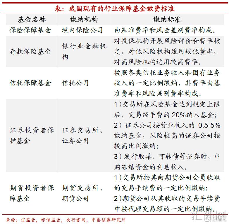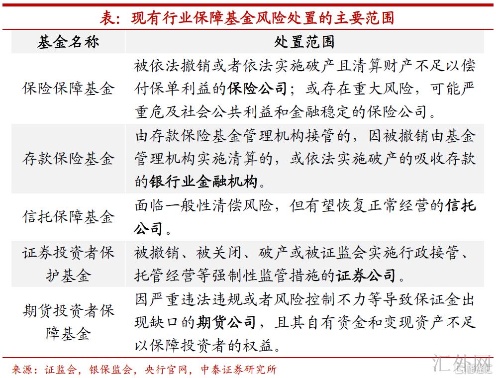 处置规模不同,重在体系隐患。首先,既然各行各业已经存在相应的保障基金,为何要再设立“金融平稳保障基金”?这首要是因为于风险处置规模的不同。金融平稳保障基金首要为巨大风险处置储蓄后备资金。依据银保监会新闻官员的表述,“金融平稳保障基金用于具有体系性隐患的巨大风险处置,与发挥常规化风险处置作用的存款保险和行业保障基金均为我国金融安全网必不可少的部分”。自此可见,金融平稳保障基金与我国现有的行业保障基金之间的关系是互相补充和完善,行业保障基金首要针对行业内部个别的非体系性金融风险的处置,而金融平稳保障基金首要负责体系性、跨行业的巨大金融风险处置。