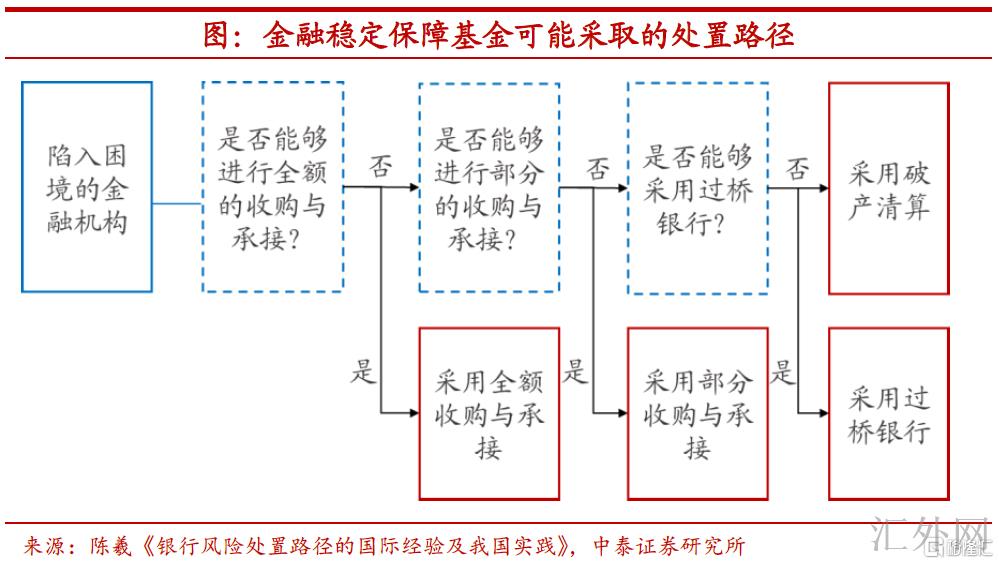风险处置四类方式,结合事实择优斟酌。发达国家的市场化风险处置大差不差可以分为四类:一是破产清算;二是收购和承接;三是因为过桥银行承接困难机构的业务并持续运营管理;四是连续运营救助。我们预期,我国金融平稳保障基金对于风险处置预期将基于成本最小化和市场化原则在以上方式中择优斟酌,其中破产清算和收购承接的运用频率或许较高。