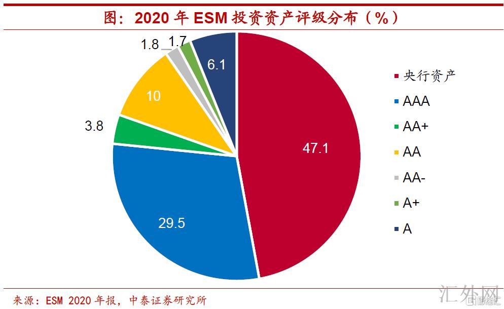 投资规模有高流动性和安全性需求。第四,从海外实践经验来说,执行事前缴费出资方式的金融平稳保障基金的余额仅限于存放在银行存款或投向安全性较高、流动性较强的资产,以欧洲平稳机制(ESM)的投资资产为例,2020年,ESM投资于中央银行资产或评级为AA-以上资产的比例高达92.2%。