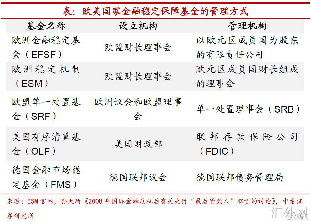 从环球上来说,设立金融平稳保障基金是部分发达经济体处置金融风险的广泛做法。2008年金融危机后,欧元兑美元首要经济体渐渐完善金融风险处置机制,其中,美国设立了有序清算基金(OLF),用于支付美国联邦存款保险公司(FDIC)在处置体系重要性金融机构过程中造成的各类费用;欧洲先后成立了欧洲金融平稳基金(EFSF)和欧盟单一处置基金(SRF),分别针对主权债务风险和处置深陷窘境的银行,2013年后,欧洲平稳机制(ESM)取代了EFSF,SRF、EFSF以及ESM对于限制债务危机以及助推欧洲货币一体化起到了核心作用;德国则在危机后增设了金融市场平稳基金(FMS)。