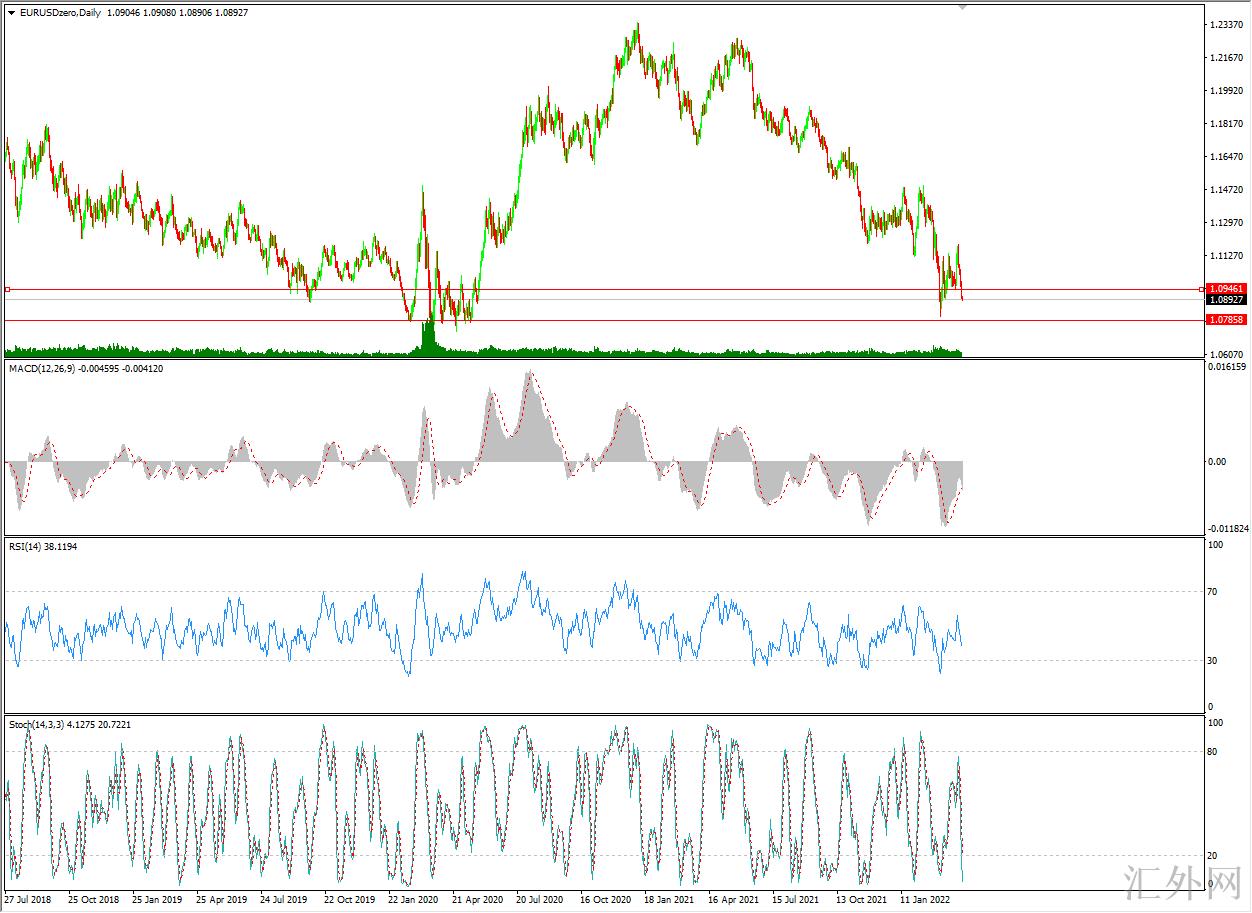 美欧货币对压力点看到1.095为原支撑点,忽然后打开以下局势形成压力点,支撑点看到1.077. 4小时级别,RSI处在超卖区域。天图级别,MACD再零轴以下快线朝下穿过慢线,形成死叉,后市看空。买方交易者宜出场,卖方交易者可稳健建仓入场。