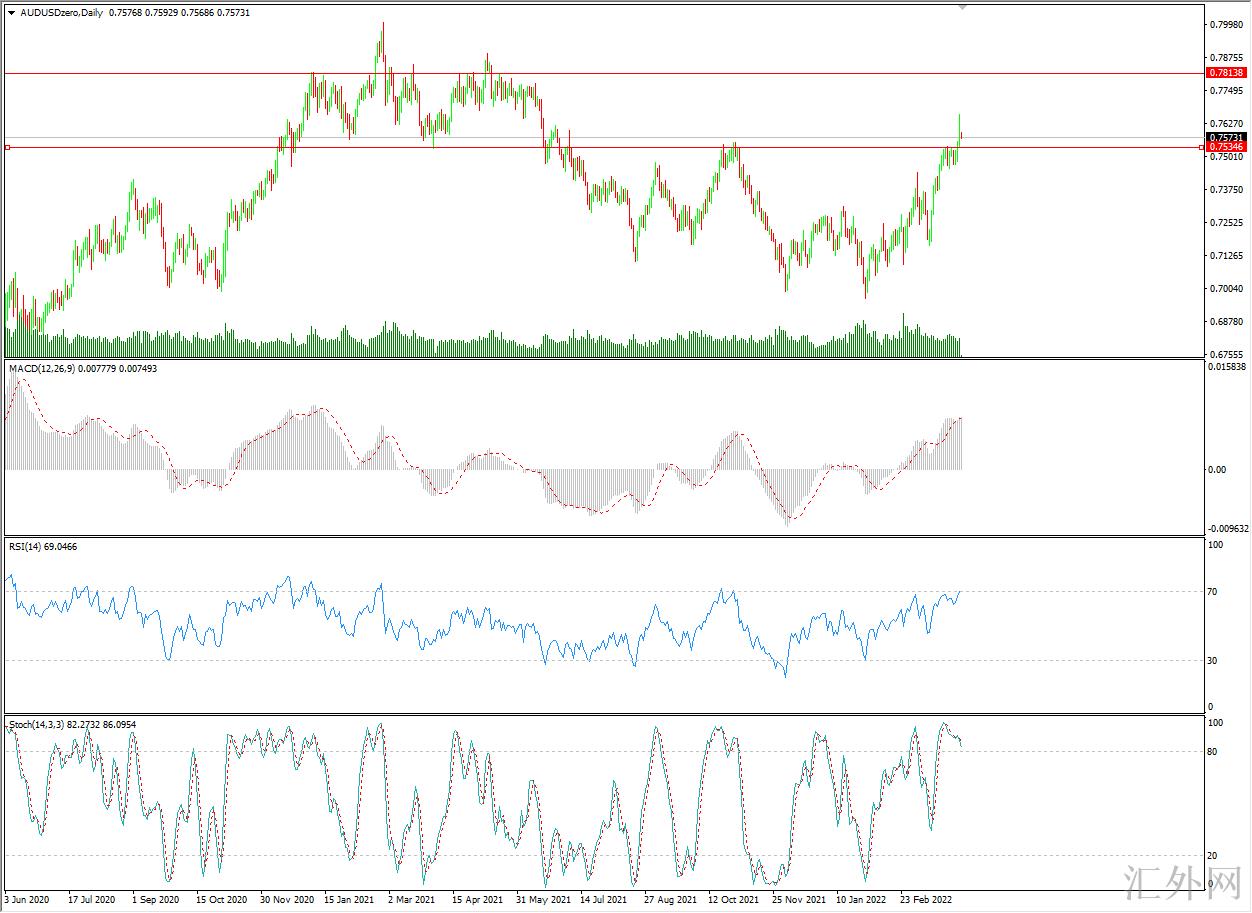 AUDUSD压力点看到0.781,支撑点看到0.753。天图级别,K线收图倒锤头,为反转信号。RSI靠近超买区。KD指标在80区域上形成死叉,为出售信号。买方交易者宜出场,卖方交易者可稳健建仓入场。