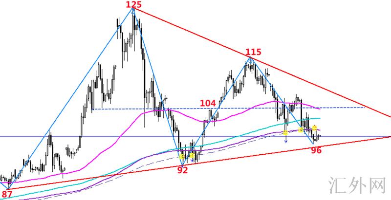 最近因俄乌局势发酵,原油最多攀升125美元左右,为2008年末以来最高;因西方制裁致使俄罗斯石油出口受扰,欧洲和美国盟友商谈禁止进口俄罗斯石油。隔日由于美国准备与盟国对俄实行额外制裁,包含能源制裁;环球能源署规划宣称放出1.2亿桶,原油受此影响日K线收阳重返100关口。当前原油处在三角形震荡整理,仍未跌穿87—92的上涨趋势支撑线,日K线遇阻于布林中轨走跌,MA5—MA10均线死叉下探抑制;而月线以流星线收官,上方具有长长上引线,代表高点有大批卖方抑制,局势上依旧卖方占优。今日操作上可在98左右布局多单,回弹104左右可空。