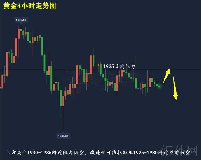 黄金技术分析来说,日K线上,隔日黄金遇阻MA10日移动均线展开下探,并在刷新日间低点后回涨,报得小阳十字星,日K线上,今日行情开盘持续遇阻均线抑制下探,日间有希望持续遇阻;4小时上,隔日黄金持于中轨左右交投,盘中涨跌互现,最终仍遇阻于中轨以下,目前布林带处在平口期,MA均线迈出双死叉,KDJ随机指标三线并拢往上,MACD指标红色量能柱适当显现,快慢线粘合向前,综合来说,黄金当前技术分析遇阻异常强,日间推荐依旧依托隔日压力执行买跌,上方注意1930-1935左右压力,激进派也可依托短时间压力1925-1930左右提早进场买跌。