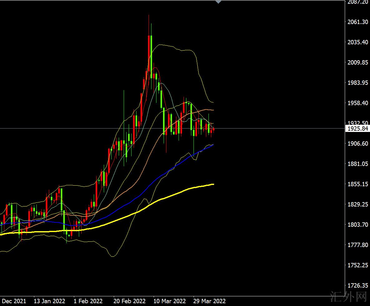 4小时看,布林带持续缩减,区间在1917-1933,上方60日移动均线及120日移动均线下翘抑制区间在1932-1936,买方不破不立,要么盘整以时间换空间再上探,不然很大约率回踩蓄能。