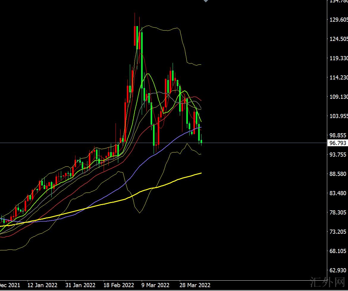 日K线看,自从美国大范围放出原油库存后,行情上方抛压重重,昨日差不多8美金降幅,空势强势,当前已经跌穿主力决策线60日移动均线101,短时间压力看5日移动均线100,以下支撑看布林下缘93左右。突破则看120日移动均线89左右。