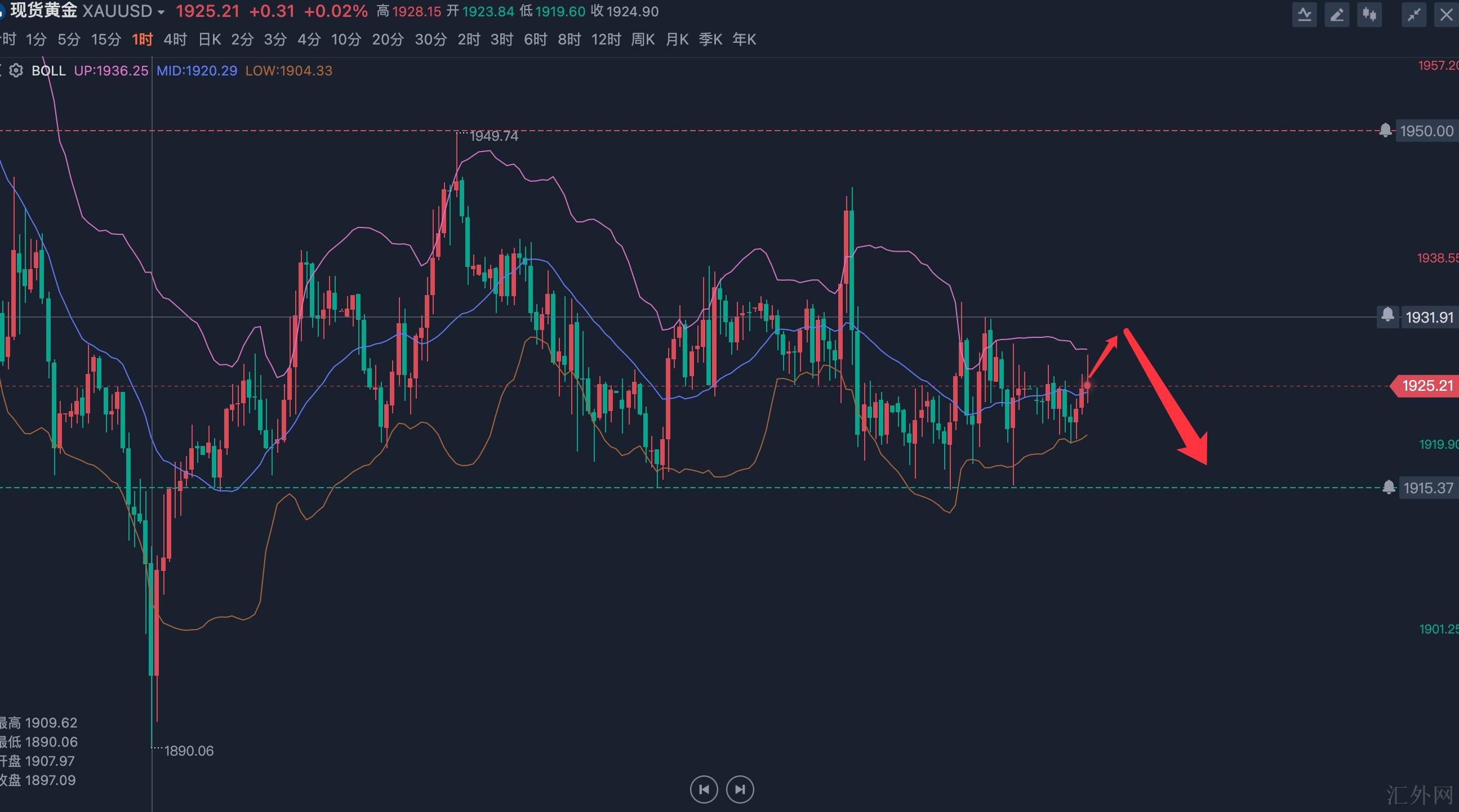 黄金行情分析:黄金昨日开盘价格1923美元,最低跌向1916美元,随后黄金价格保持上升,最高涨到1938美元徘徊。昨日黄金也连续在窄幅震荡中,当前日K线已经震荡了半个月之久了,震荡的时间越长,后市的行情越大,单边的几率越大,所以耐心等候单边行情,周线的10日移动均线支撑,前期1915低位支撑,跌穿此区域,黄金才会更深一步下探,没破以前,不要低点买跌,以震荡对待!上方抑制在昨日内新高点1938-45左右,恰好日K线的20日移动均线抑制在1945名置,所以今日上方抑制在1938-1945名置,综上所述秦氏金升归纳:黄金最近接连的区域震荡,以下的支持在1915一线持稳回弹,注意1940-1945美元压力,随后防坚守1958区域,今日预计先涨后跌,操作上斟酌高空低多策略,上方注意1938-1945美元压力,以下注意1920-1915美元支撑。