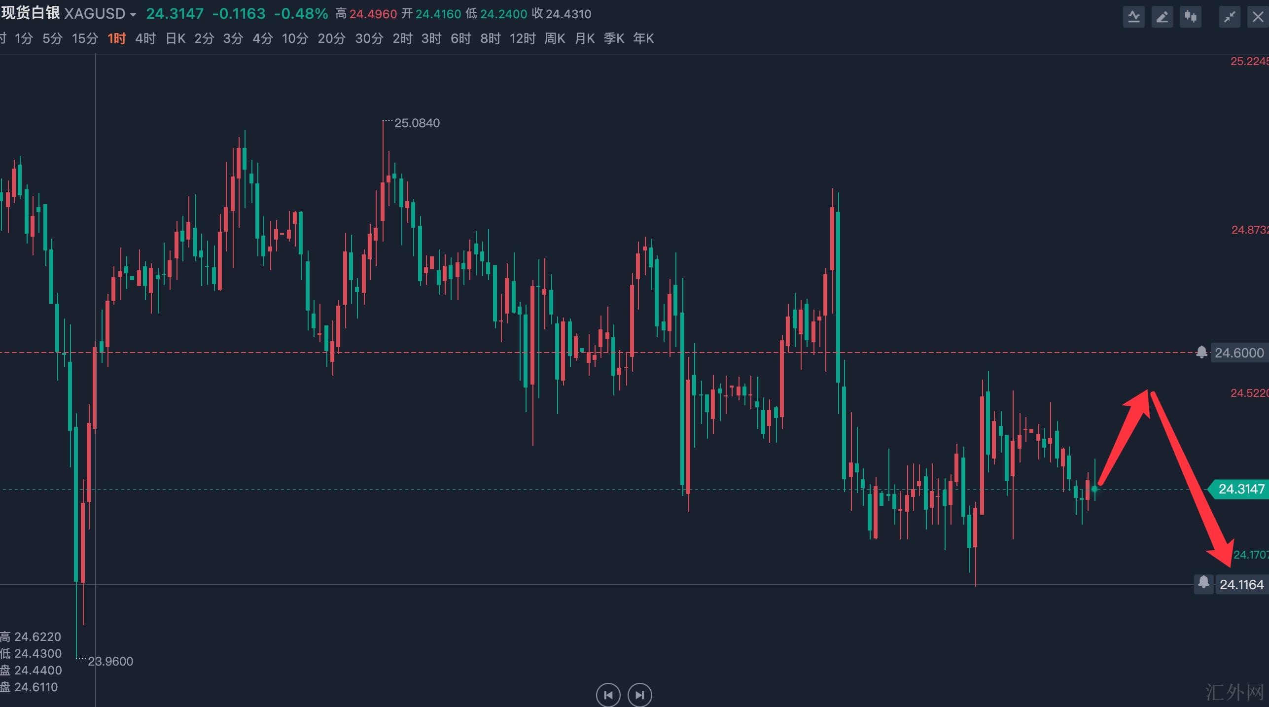 现货白银行情分析:现货白银在日K线走了两个异常典型的回弹证实后面的二次下挫行情,昨天的差不多是完成了第三次回弹证实,当前K线持续遇阻短周期均线偏空运行。昨日白银亚盘开盘在24.31的位置后行情先回调给出24.11的位置后行情推涨,日K线最高刷新到了24.56的位置后行情整理,日K线最终收线在了24.45的位置后行情以一根下影线长于上影线的中阳线收线。截至当前,白银盘内当前临时平稳在24关键点位左右,要着重关注白银价格近期的保持下探行情,今天银价上方注意24.60美元压力,以及24.75美元压力;以下注意24.15美元支撑,以及23.90美元支撑。