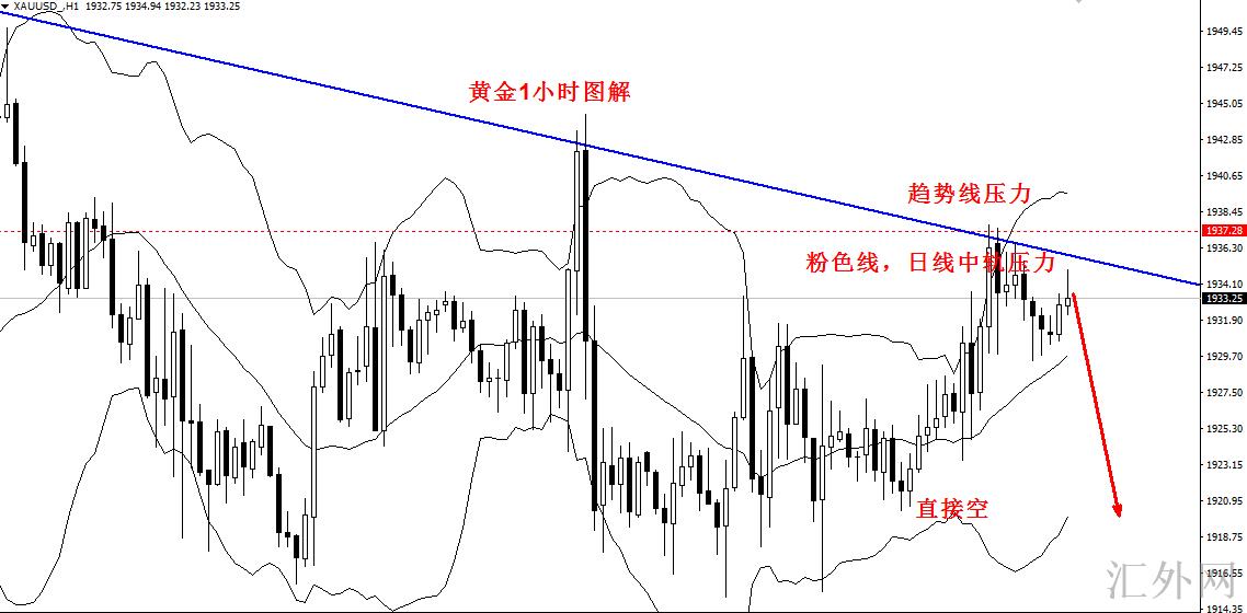 昨夜黄金价格遇阻于日K线中轨和趋势线,双重阻力使黄金价格止步于1937以下,今日1935阻力位直接放空黄金。