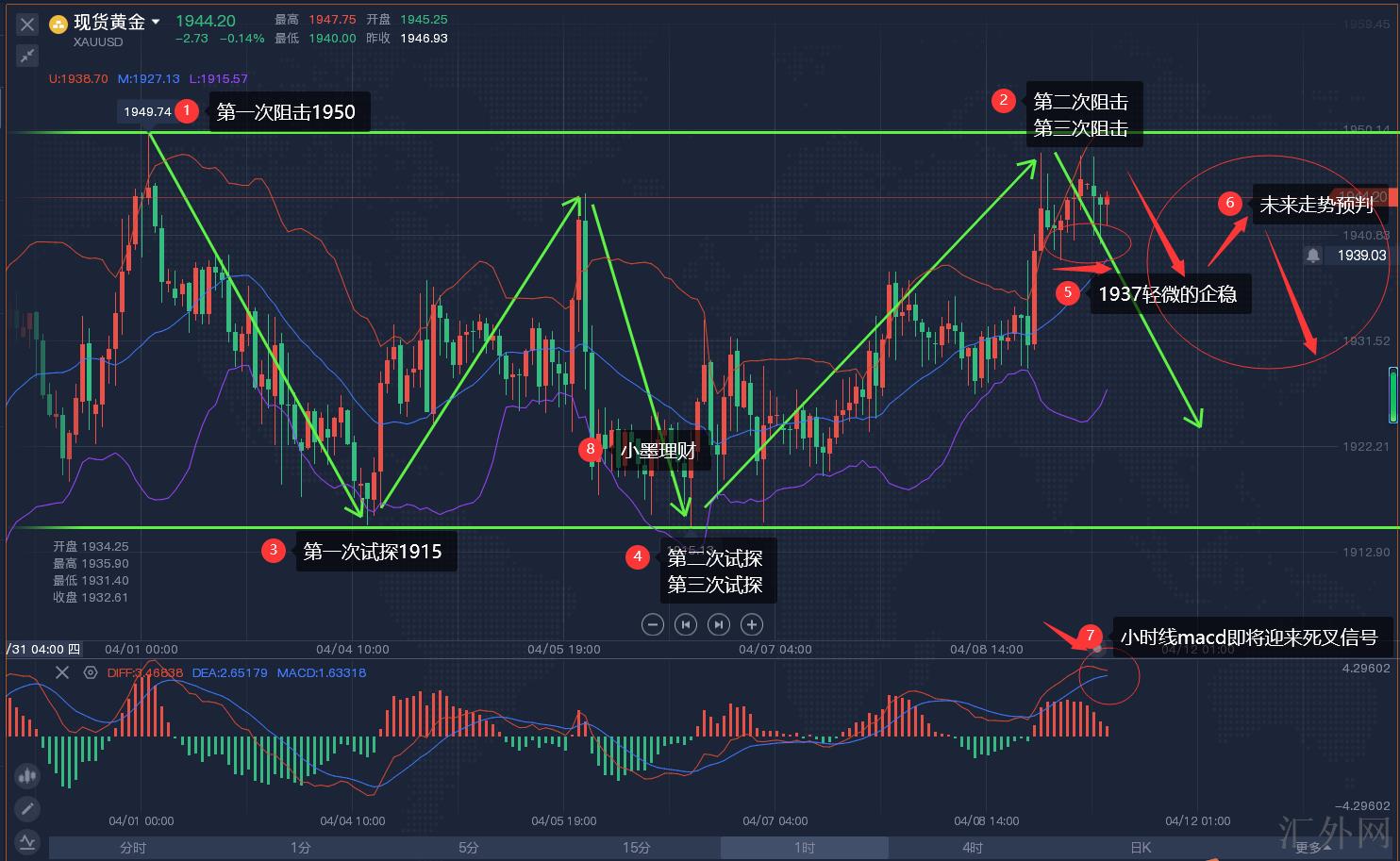 黄金小时线MACD死叉叉住了,当前行情符合早就间预判