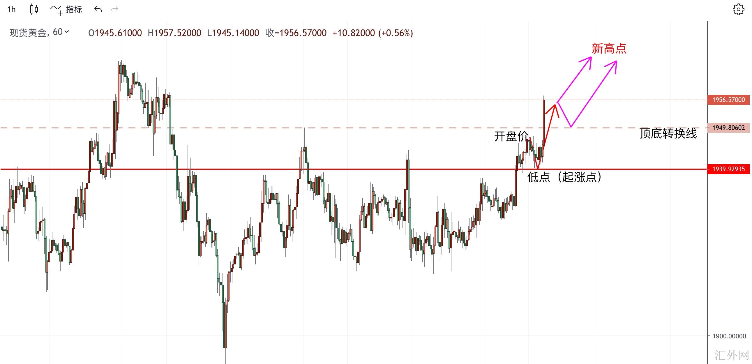 依旧稳了一手,1939起涨,但是结构一样,当前黄金价格往上击穿1950的压力,交投于1955左右,当前等候的就是1966左右的高位形成,后市交易参考可以先多,首要是怕给不了回踩,假使有回踩,我们再加仓跟进即可。具体就是现价1955直接进多,计划看1966,假使有回调持续加仓买涨,计划不变,全部止损位放在1948。