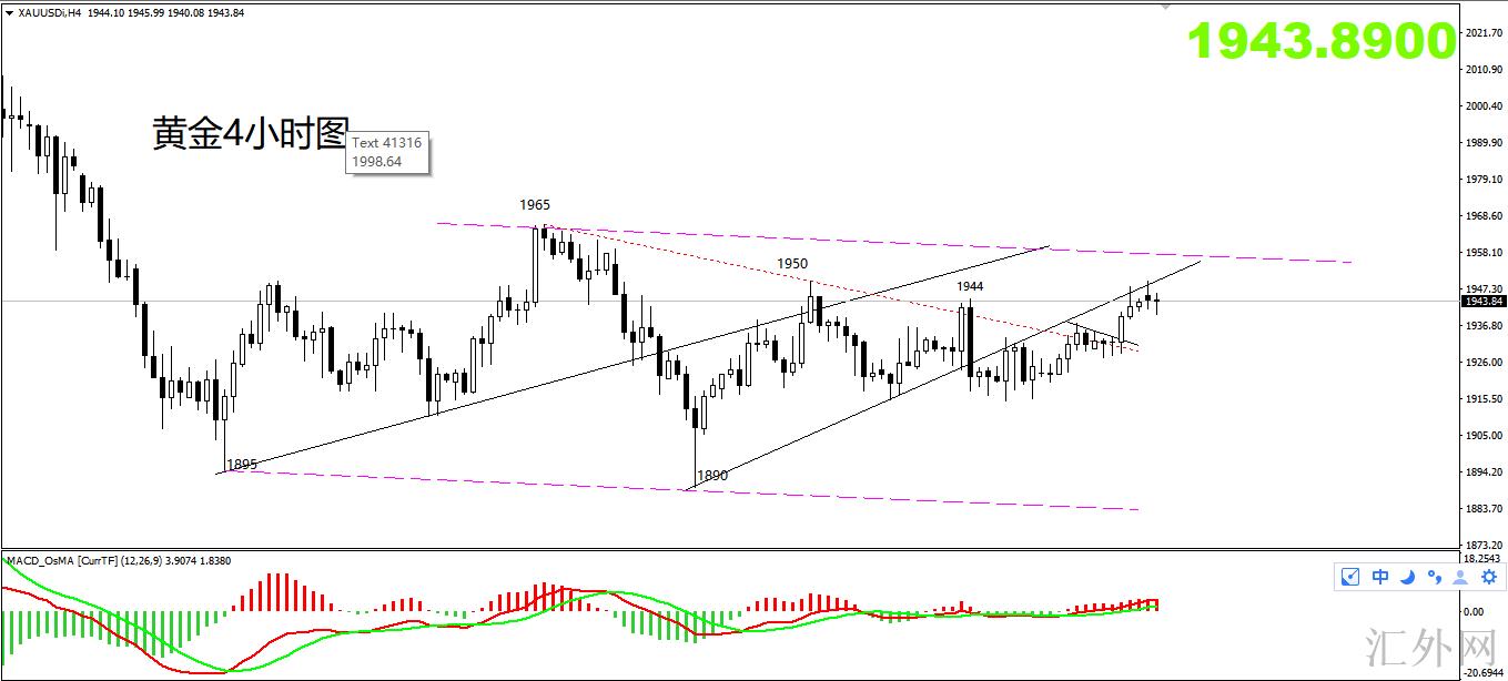 短线1小时层面,黄金价格从1915形成了完成了上涨通道,在通道上缘1949遇阻后,开始了1小时级别的调动,从今天早间的调动强度来说,属于震荡下探的调动,强度不强,便意味着今天持续走高峰的机会,短线注意的是MACD快慢线又一次金叉的位置,若今日欧盘在1939已经调动到位,直接破高峰,则需求注意黄金价格位置较高,便容易在高峰后形成初始的顶背离信号,当前更看好于该种行情,到时则注意4小时压力1957的开空机会,若在没走高峰前,快慢线逐渐下探至零轴左右,正常回踩,则消除掉顶背离的机会,到时注意通道下缘1938左右的接多机会,上星期五在1947遇阻时回调的低位1938是本轮1小时回踩强弱的多空分界线。