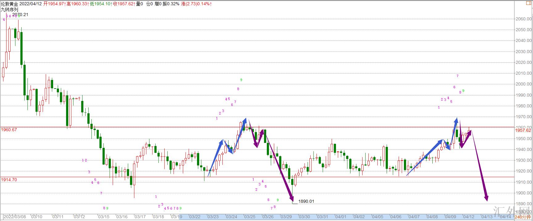 从4小时这里来说,当前黄金这里的行情和前期很类似,均为刷出1960上方高位,随后又一次试探1960在选择回踩下落。