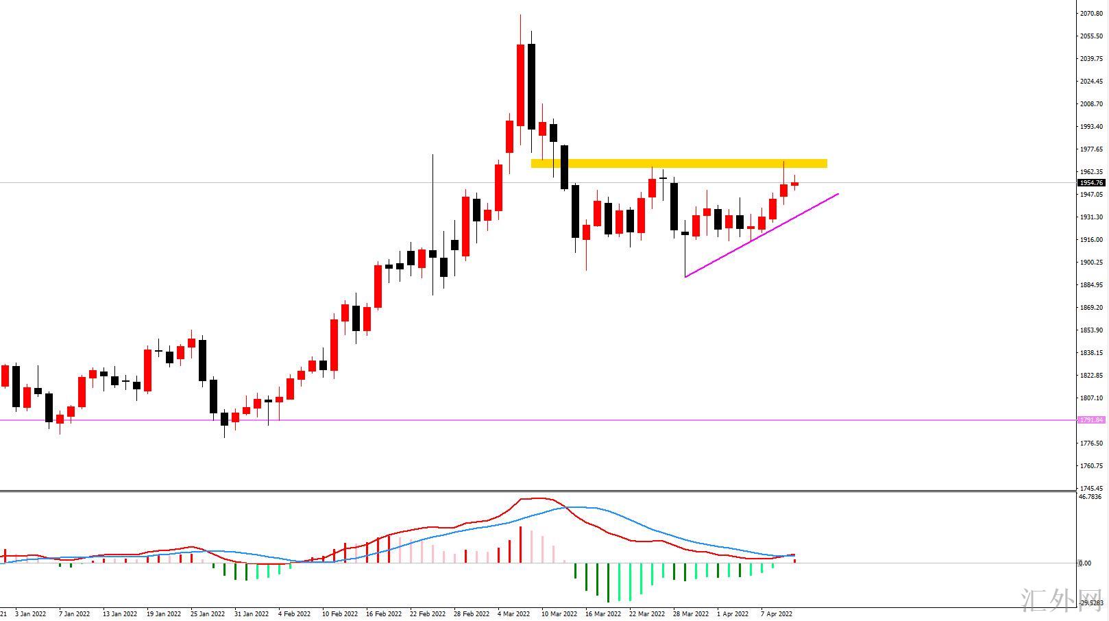 从技术指标来说,昨天暴涨后面,日线图已经MACD快慢线形成金叉,上一次显现该种信号依旧2月份的1820左右,后面暴涨了200多美元。