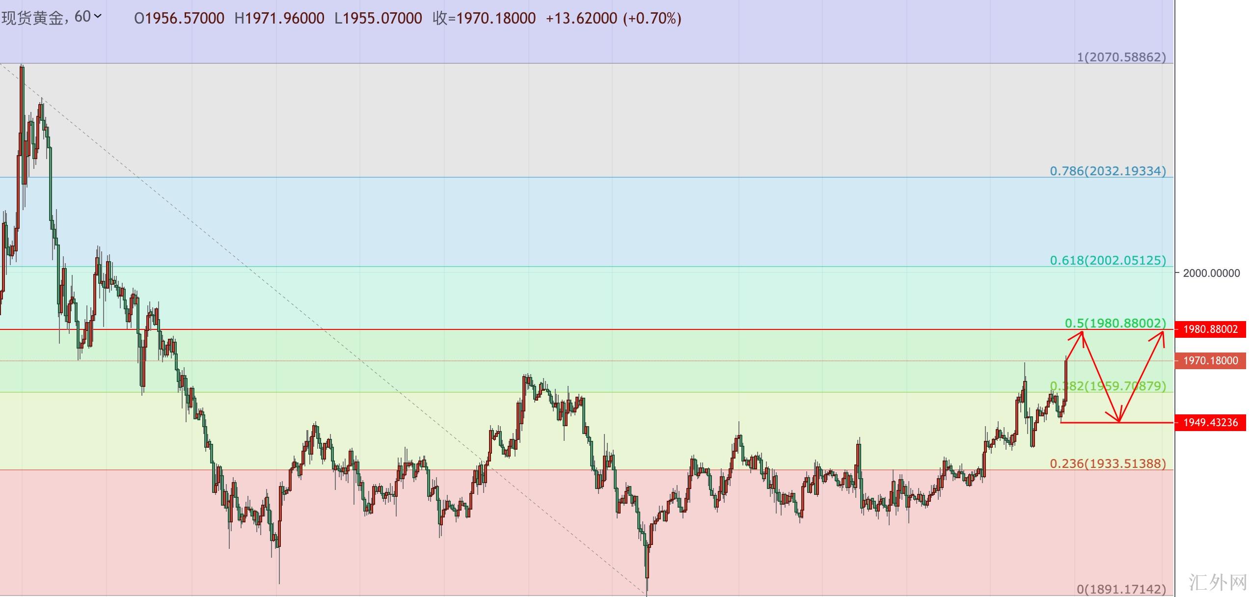 黄金价格在回撤1940美元水平受支持后连续上升,并在涨破1950美元压力后增速,最多上升约30美元到1969美元左右,创3月15号迄今高峰,但行情迅速扭转。黄金自日间高点显着回撤,差不多尽数吐回了日间升幅。但仍收盘在1950关键点位上方,日K线报得四连阳。今天黄金价格倾向高点震荡或回调,日K线支撑1946左右,压力就是2070下挫到1890(0.5的位置)1980这里;当前行情又一次往上击穿高峰,操作方向高点追涨风险偏高,上升行情博空风险也大,稳健操作等候滞涨信号进空,先目睹1980左右有没有阻力,假使不能直接贯穿此位置而且长时间横盘于左右准备买跌(起码4-6根15分钟K线)以下的话假使有机会回归1960左右准备再接多单一次。