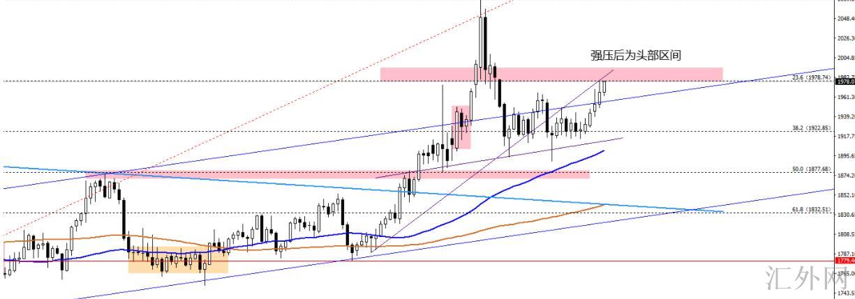 这里的高点跟以前所讲的高点就不一样了,由于强压区的最后抑制在1980,所以今天假使强压失守,买方再下一城,顺理成章的黄金会换一个区间去横盘。此时的区域,叫头部区间,曾经的2070稍微高,也不必画饼,先以1974—2010为主区间。2010为月线级别实体相连的点位,参考为大周期的次高备选之一。