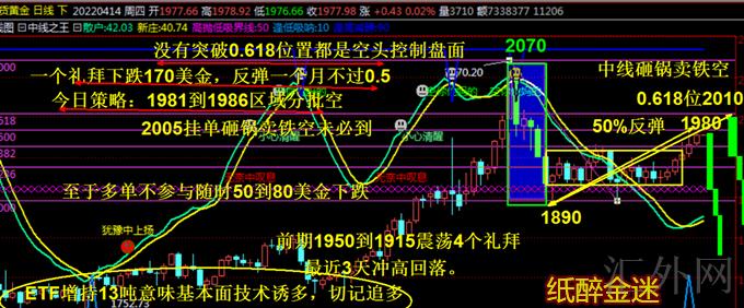 昨日行情震荡差不多符合预计,不要上来就是又涨了,盘面是隔夜1978空跌到1963区域,随后参与回弹最高也就是1980区域,差不多两天高点差不多,完美一个过山车,这个不重要,重若是1980我们可以双倍和三倍反复空,差不多每次进场1974出局轻松5美金利润,你假使参与8到10次也是50美金利润,这个比单边舒服,更核心,运行阻力左右我们敢于双倍和三倍买跌,你追多均为属于轻仓,显然利润不如买跌积极,更核心随时有闪崩显现,经历接连震荡最终收盘左肩1974上,那么也就是说黄金多空环绕2070到1890下挫回弹修复50%和0.618区域要反复争夺才可选择方向,当前目睹ETF忽然在1980增持13吨,目的就是吸引你的注意看开始买涨了,其实这个就是诱多,低点1890不去增持13吨,当下增持就是自己在期货市场逐渐增长卖方持仓,懂得人自然懂,美基本分析呢平和恢复,通货膨胀高点运行,后面加息缩表50基点同期来临大约率,而且不止一次,这就是黄金中长期有好处空头,至于乌克兰危机,应当清楚5月9号是俄罗斯国庆日,这天要终结乌克兰危机,也就是打到乌克兰服输,或者协商完成。