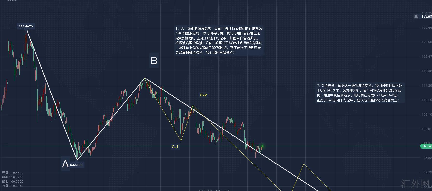 2、2、C浪细分:根据大一级的波浪结构,我们可知行情正处在C浪下探当中。为方便分析,我们可将C浪细分成5浪结构,如图中黄色线所示。现行情已完成C-1浪和C-2浪,正处在C-3增速下探当中,推荐后市整体仍以高空为主