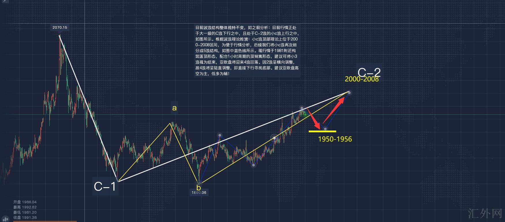 当前波浪结构整体保持不变,如以前分析:当前行情正处在大一级的C浪下探当中,且处在C-2浪的小c浪上涨当中,如图所示。依据波浪理论推演:小c浪顶部理论上位于2000-2008区间,为便于行情分析,后续我们将小c浪又一次细分成5浪结构,如图中蓝色线所示。现行情于1981左右构筑圆顶形态,配合1小时周期的顶背离形态,推荐可将小3浪看为终结,亚欧盘将面临4浪回调。因2浪呈横向调动,故4浪将出现陡直调动,即直接下探寻求底部。推荐亚欧盘高空为主,低多为辅!