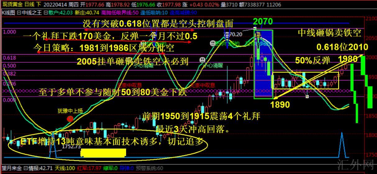 假使没有这些避险,任然1950到1900区域震荡等美联储加息指示,当下行情只有又一次突破1960才可打开下挫空间,所下方周就是依旧熟悉节奏,回弹1980上任然先买跌,毕竟熟悉盘面均为清楚行情回弹回调到前期0.5到0.618区域均为二次又一次布局进场机会。其实交易可以清楚目睹2070跌1895回弹1965又一次跌到1890区域,随后1950-1915盘整整理近一月震荡下挫,尽管这周有所击穿,但是均为上演冲顶回调,1969跌到1940区域,1978跌到1962区域。