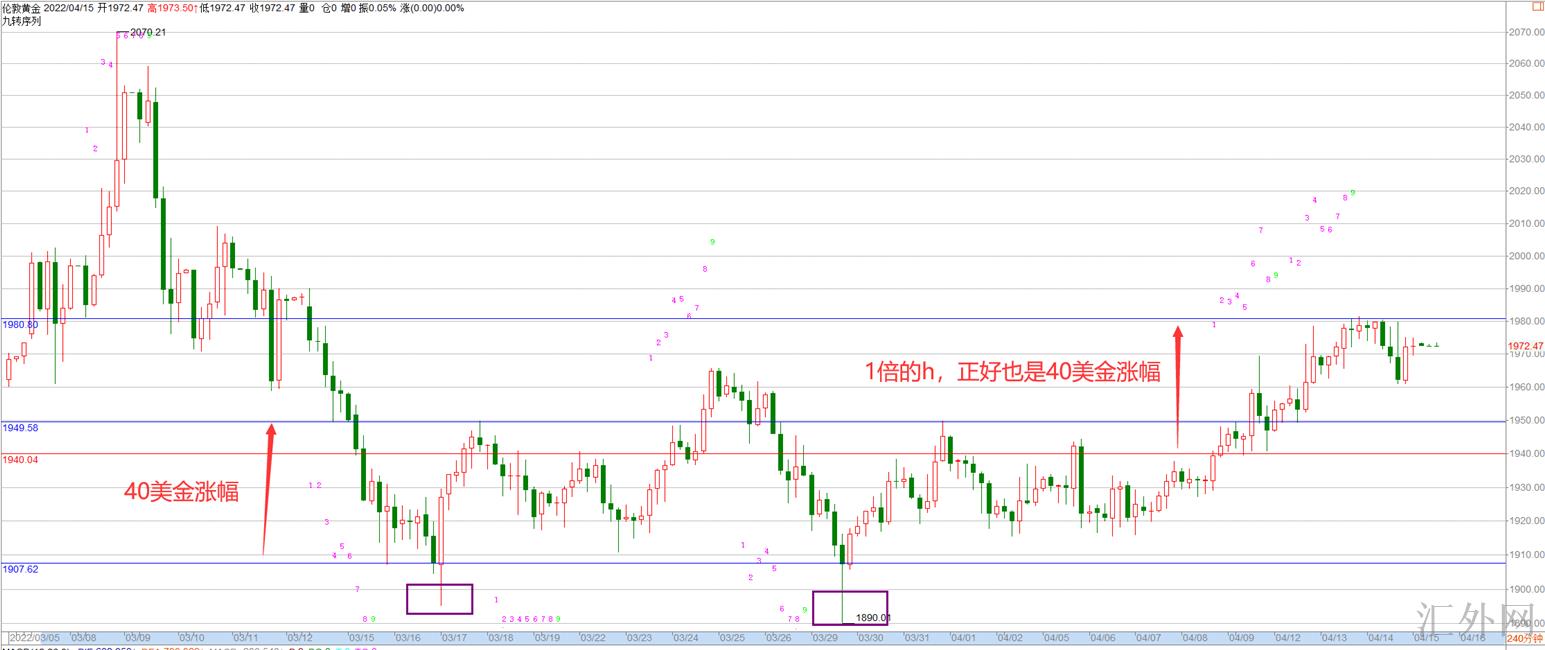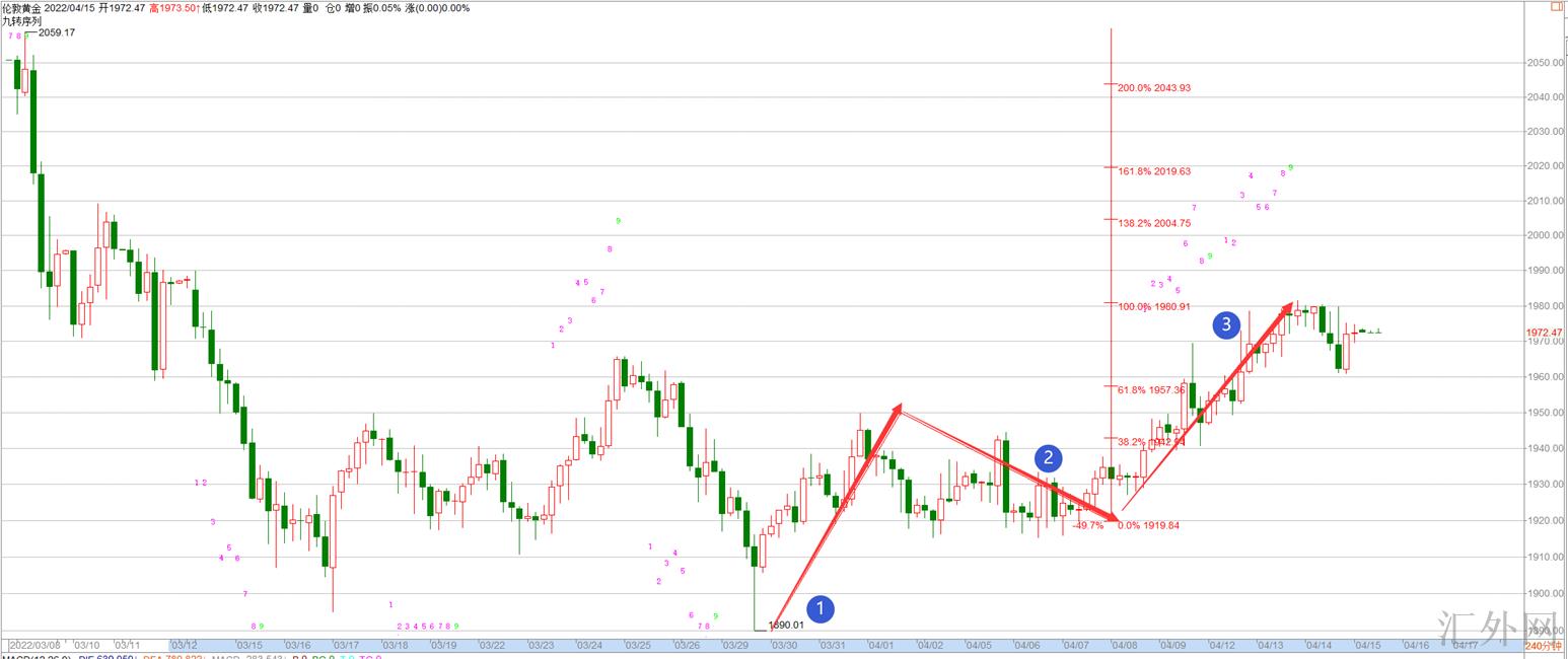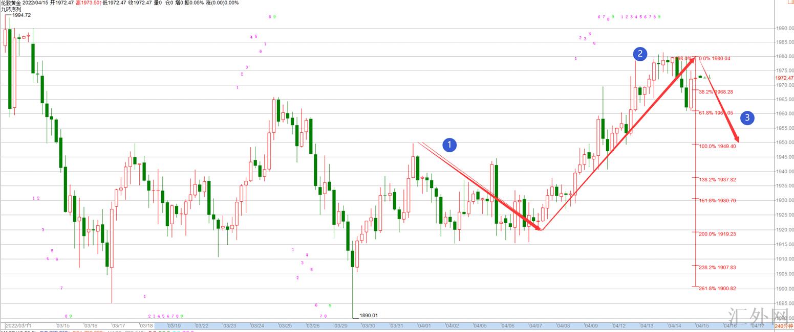 我们利用ab=cd理论来说,这段从1980回踩下来的百分比位置也是在1950,1960这里恰好是处在618支撑点,这也是为何星期四夜里能从1960回弹的原因,但是并没有能说1960这里就是底部位置。