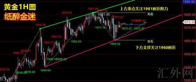 黄金从技术分析来说,从日K线来说,星期四日间黄金如预计的再次遇阻1980一线回调,欧盘时段以下回撤到1967一线,欧盘呈现接连走软的动作,但欧盘6-8点修正又一次试探了早间高位1980左右,短线仍未迈出方向依旧循环震荡。从日间黄金的状况来说,1980一线依旧如预计的起到了相应的抑制作用,整体趋势黄金近几天显现反复破高仍未形成保持,上升的量能渐渐降低,接连高点盘整趋势就会酝酿转折。依照当前盘面来说,短时间依旧未能解脱高点的区域震荡,下周周初依旧关注高点的区域震荡情形,上方1978/81一线,以下1962/60左右,高低位首要参考点,保持区域震荡的同期,主方向依旧倾向买方延伸看待,若朝下击穿在做思路调动,具体的以当日交易日实时思路更新为主!星期四黄金价格在高点显现强劲震荡,终结了前期的单边上升,在下周初,黄金价格大约率会在高点保持该种大区间震荡行情。所以,不管是震荡依旧阴线,总之在星期一以买跌为主,具体的入场点则是等候短周期中的到顶信号。综上所述,黄金下星期一交易参考上纸醉金迷推荐回弹高空为主,回踩低多为辅,上方着重注意1983-1985一线压力,以下短时间着重注意1955-1960一线支撑。