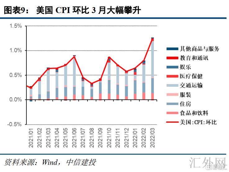 从美国3月通货膨胀报告来说,通货膨胀阻力有所下滑,5月通货膨胀报告是否到顶适合关注。美国3月CPI同比上涨8.5%,好于预计的8.4%,创1981年12月(差不多40年)以来最高。但不包含食品和能源的核心CPI同比上涨6.5%,差于预计的6.6%。美国3月CPI环比上涨1.24%(2月0.8%),分项来说,能源价格攀升是助推CPI环比上升的首要原因,交通运输和住房项目对CPI环比拉动从2月的0.35pct、0.2pct分别提高到0.74pct、0.3pct。其余分项的变动则不太显著,加上核心CPI同比增速已经显著减缓,美国通货膨胀或马上到顶。