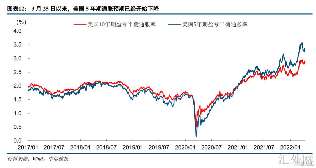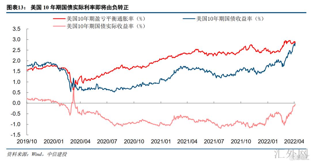 其他观察着重在于10年期美债收益率能否会在连续上涨后转变为高点震荡,差不多走平的形态。3月25号迄今,美国5年期通货膨胀预计显现显著回调,10年期通货膨胀预计也适当下探,表明通货膨胀阻力有所减缓。但美联储的鹰派态度还在连续,10年期美国国债收益率连续升高,当前已经和通货膨胀预计较为靠近。这也代表着流行病后开放的负事实利率时代马上终结。