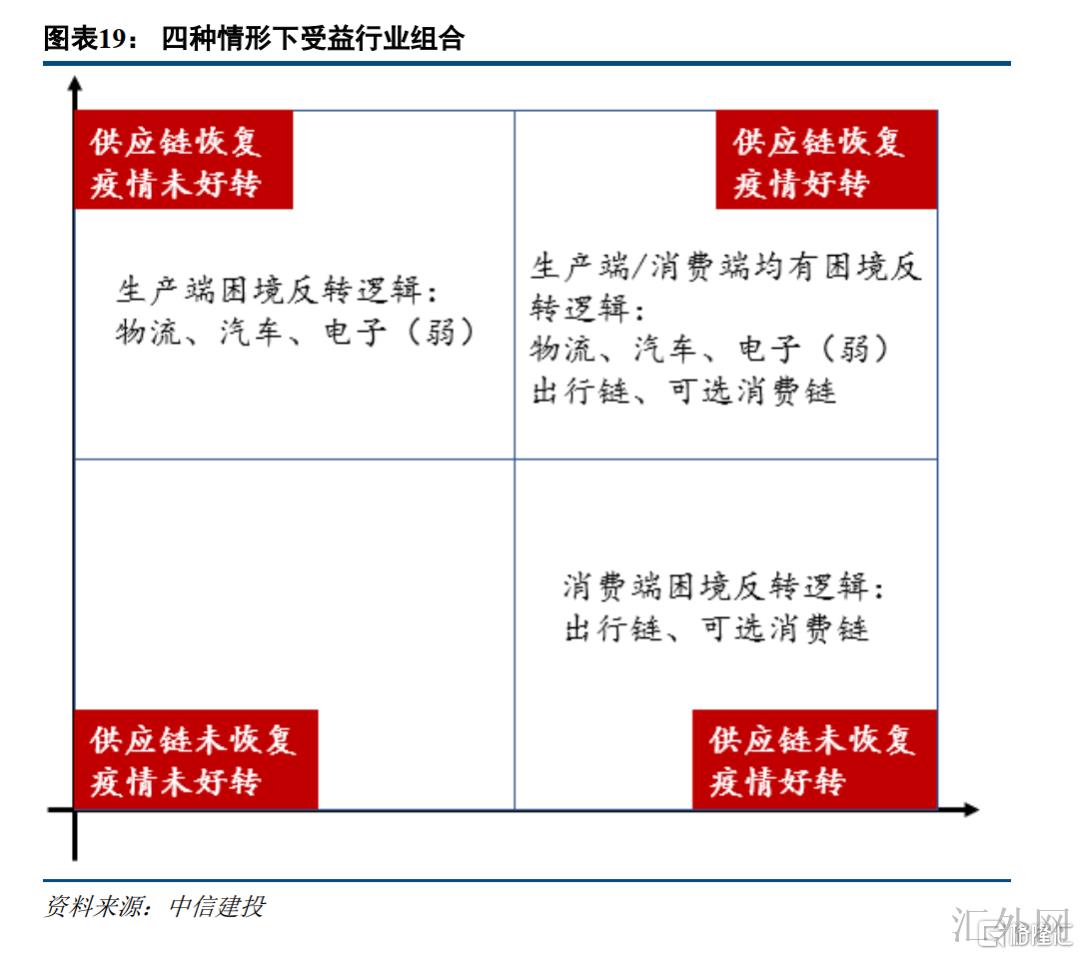 伴随流行病对经济的负面影响开始逐渐显现且扩散,目前市场对于后续转折点及提供链复苏存在较大的期望。对应后续四种或许发生的情形:1)流行病显著转好,提供链复苏;2)流行病转好,但为防止病毒传播扩散,提供链仍遇阻;3)流行病未转好,提供链率先复苏;4)流行病未转好,且为防止病毒传播扩散,提供链仍遇阻;所对应的受益行业组合可见如下四宫格。后续来自生产及消费端的窘境反转逻辑有希望轮番演绎。