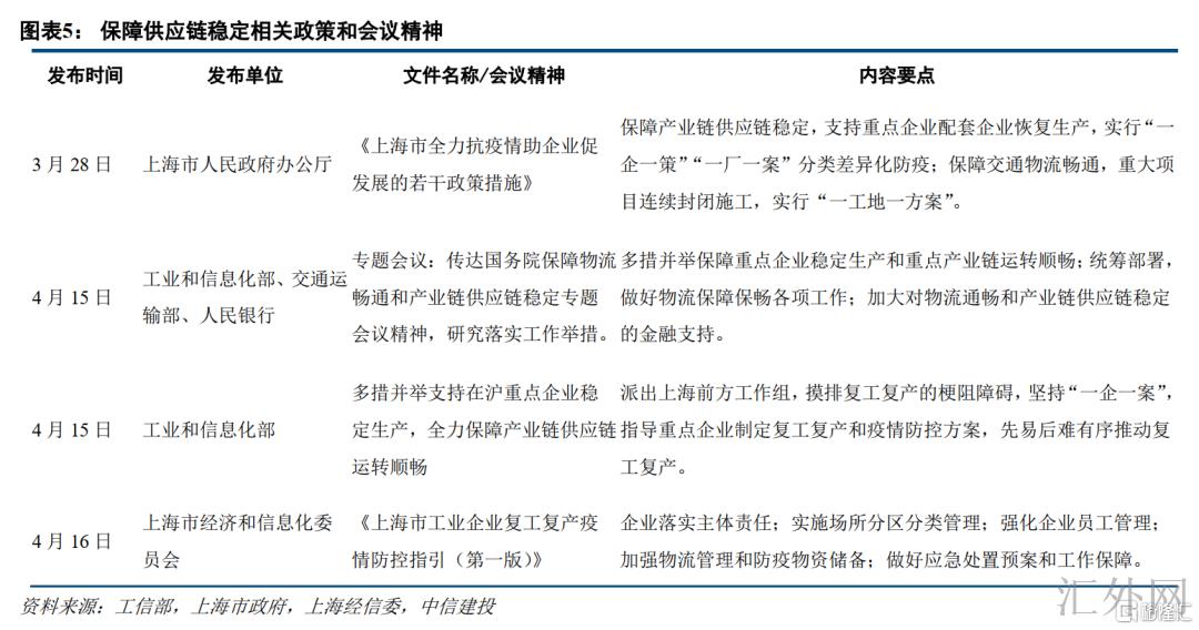 另一面,由于上海在我国经济和汽车等核心产业链中的重要地位,着重企业平稳生产,保障提供链平稳已经形成迫在眉睫的困难。4月15号,工信部、交运部、人民银行召开专题会议传达国务院保障物流畅通和产业链提供链平稳专题会议精神,研究落实工作动作。同日工信部派出上海前方工作组,摸排复产复工的梗阻阻碍。次日,上海市经信委公布《上海市工业企业复产复工流行病防控指示(第一版)》,文件强调:企业落实主体责任;实行场所分分辨类管理;加深企业雇员管理;增强物流管理和预防疫情物资储备;做好应急处置预案和工作保障。据央视发文,上汽集团4月18号将起步复产复工阻力试探。在此之前承受流行病的影响,上汽集团在3月中下旬在上海的工厂执行了闭环生产,4月份部分工厂相继停工。