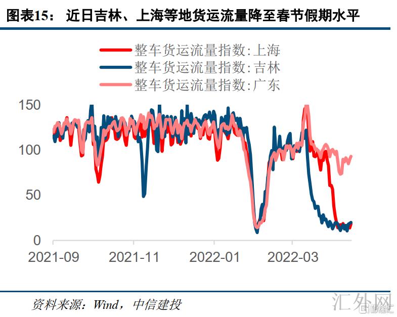 【物流】3月中下旬以来,流行病影响及防控升级环境下,全国整车货运流量指数、首要快递企业分拨中心吞吐量指数及公共物流园吞吐量指数均连续下探。截到4月14号,三者日均值同比降幅分别为-27%、-39%、-39%,其中尤以上海、吉林等流行病暴发地区的货运流量指数下探最为严重,最近指数已下探至春节淡季极低点水平。同期,上海流行病对周边省份物流亦产生不小打击:4月以来江苏、浙江两地整车货运流量日均值分别为-41%、-18%。