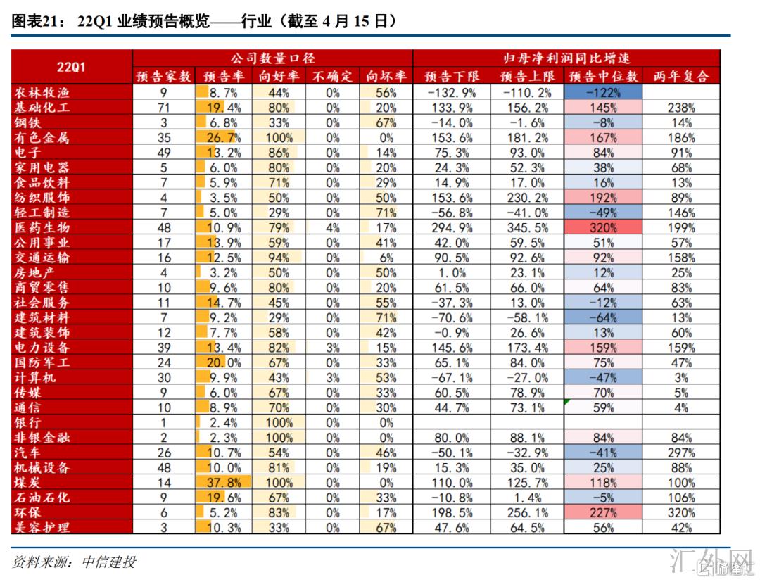 刨去板块中部分个股极值后,高增速高景气行业首要汇聚在:① 周期:石油、煤炭(活力煤、焦煤)、有色金属(新能源金属/铝/铜/稀土)、化工(氟化工/化肥)、航运/港口② 高端制造:电新(光伏、风电设备、锂电材料)、军工、智能化汽零、半导体设备/材料/IGBT;③ 医药(冠状产业、CXO)、高端/次高端白酒、城商行、新能源经营/燃气等方向。而预期差于预计的板块则首要集中三条线索:流行病影响(消费)、上游涨价(中下游制造)、地产萧条(地产链),具体包含:餐饮链(食品、啤酒)、医疗服务/血制品、生猪养殖、家电、消费电子/面板、光伏辅材、电池制造、汽车及传统汽车零部件、碳纤维、钢铁、水泥、火电、炼化、地产、股份行。